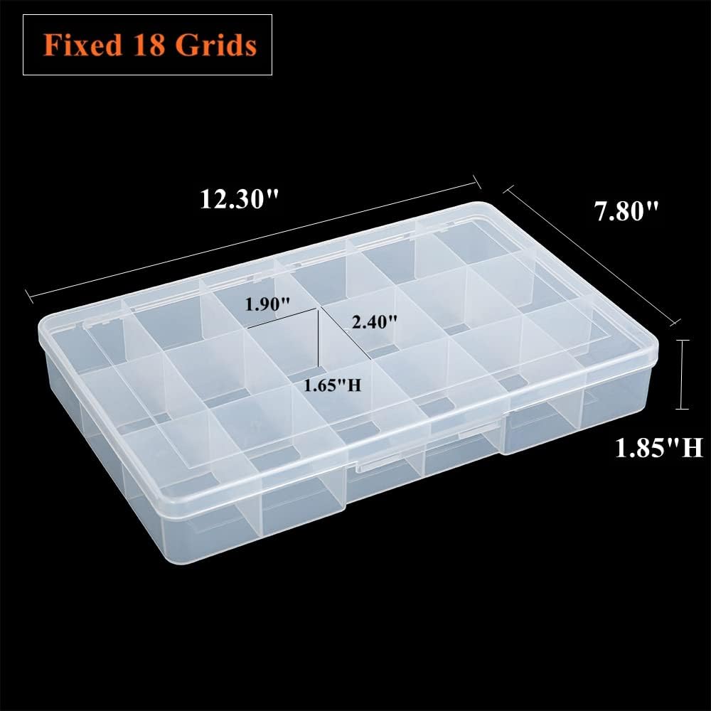2 Pack Fixed 18 Grids Clear Plastic Compartment Container Case, Transparent Organizer Storage Divider Box with Lid for Bead, Button, Hardware, Screw, Sewing Kit, Craft Supplies