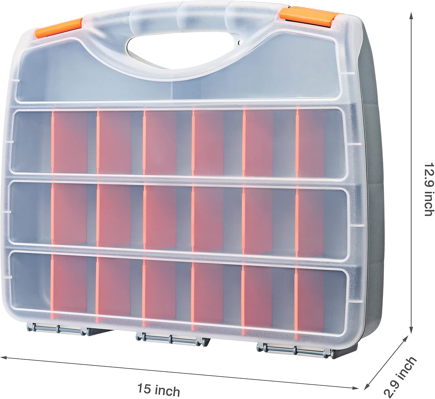 - The tool box organizer is made of durable and heavy duty plastic material. Well design with professional looking. An attractive color combination in gray body, clear lids, orange closure and divider pieces